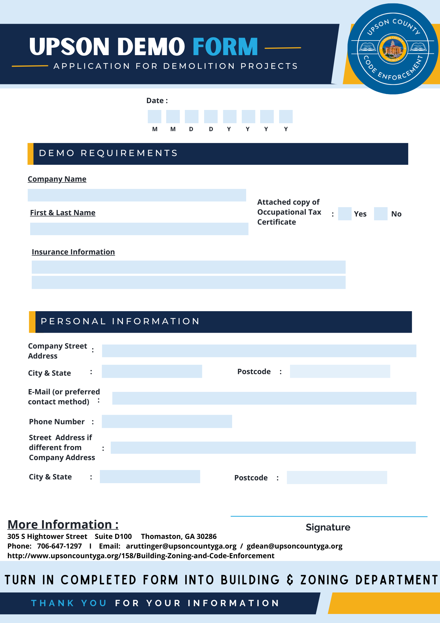 WOULD YOU LIKE TO BE A DEMOLITION CONTRACTOR FOR UPSON COUNTY? View the Upson County Demo Application Form, and turn in to the Building & Zoning Department!